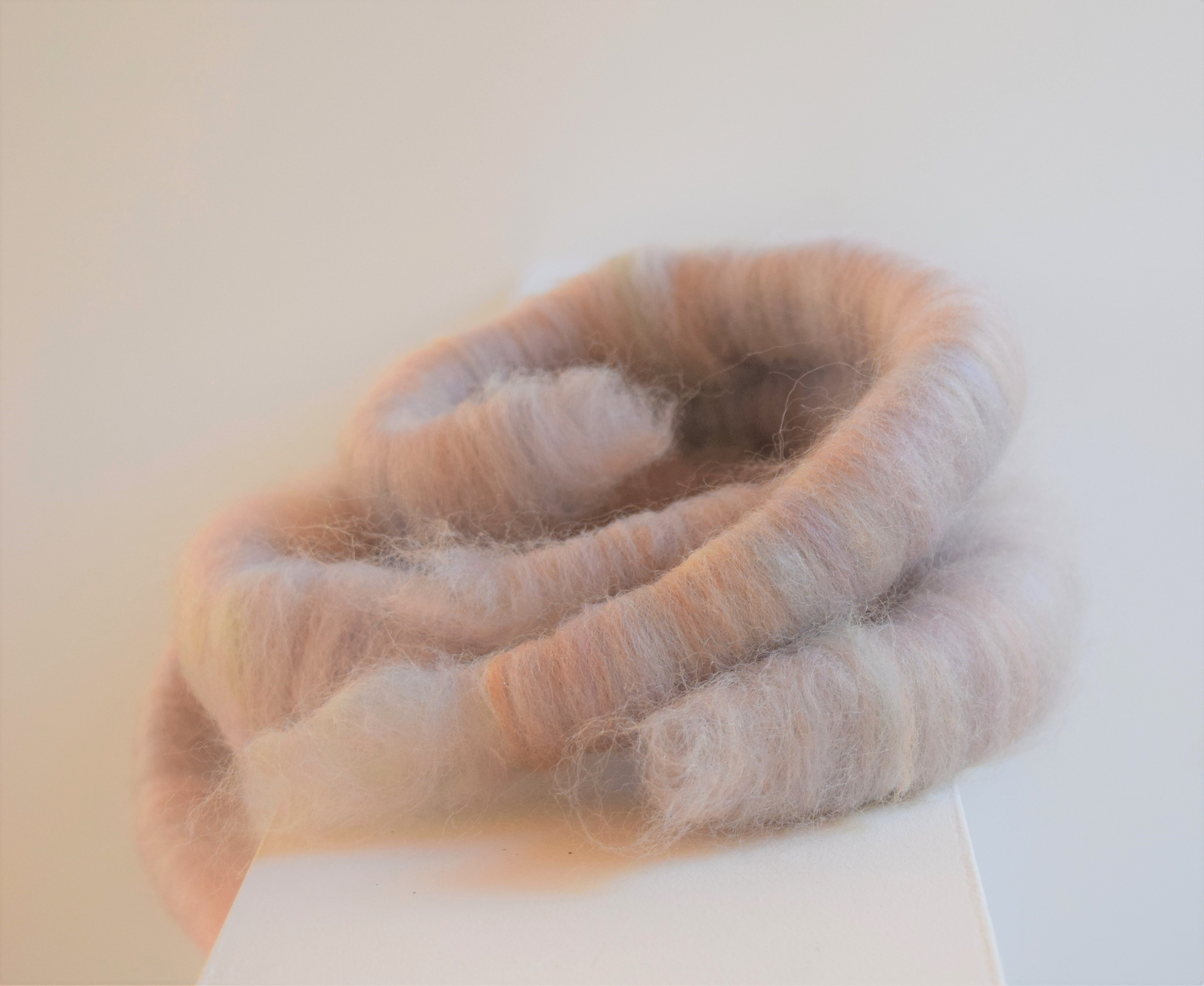 jenjoycedesign© opalescent mix 13 Published July 8, 2019 at 3273 × 2680 One last blend, then rolled off rolags on to knitting needles.